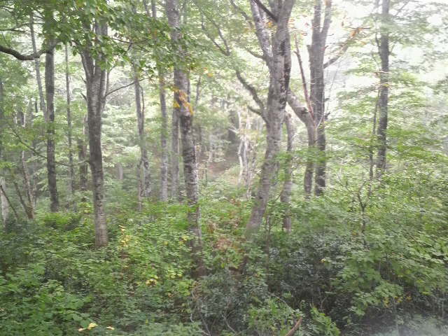「三神の杉」付近のぶな林のなかを行く。